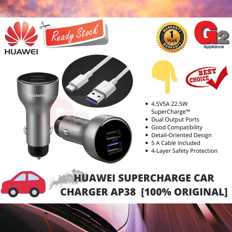 original huawei ap38 supercharge car charger 4 5v 5a max 22 5w dual usb with 5a type c cable