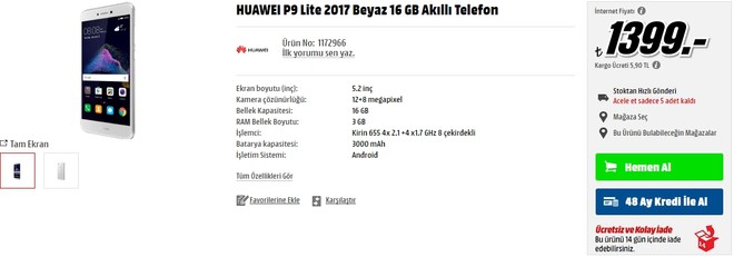 huawei p9 lite 2017 ulkemizde satisa