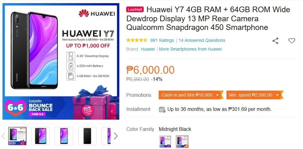 huawei y7 2019 4gb 64 gb black purple price drop